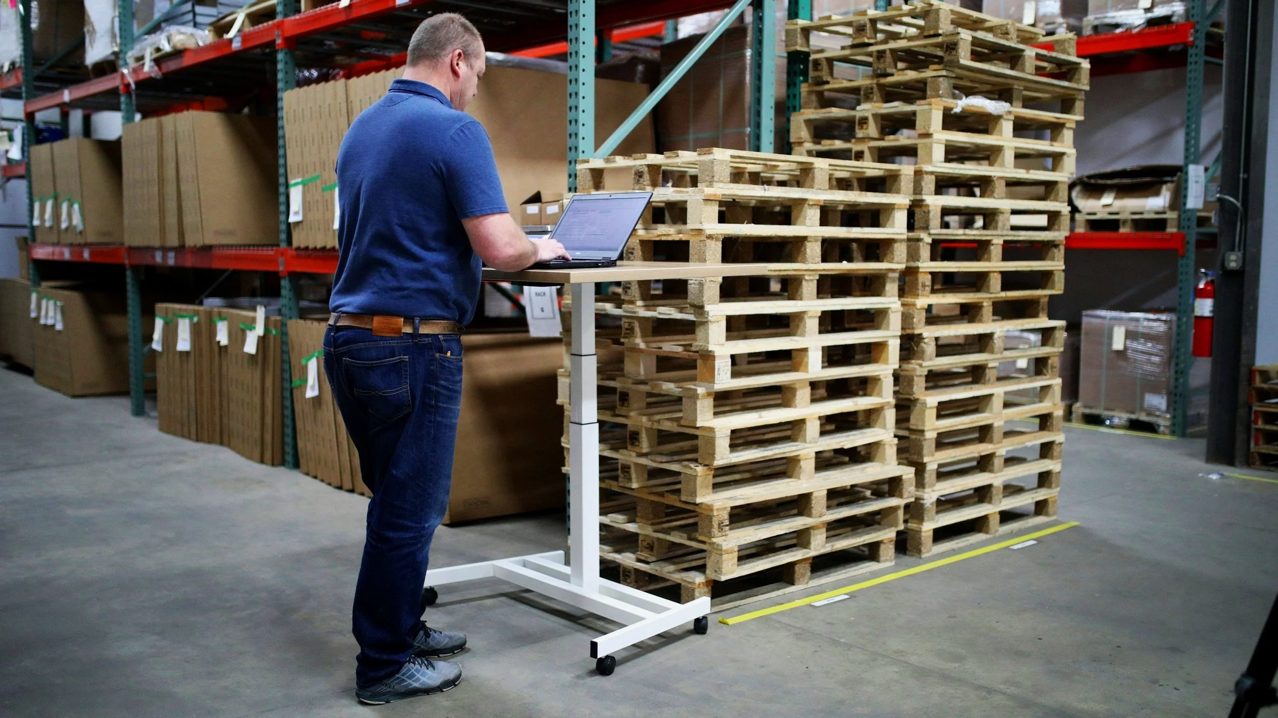 Person using a laptop on a standing desk in a warehouse, surrounded by stacked wooden pallets and shelves with boxes.